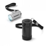 Aluminium flashlight with 6 LEDs. Includes 2 CR2032 batteries. 28 x 40 x 28 mm