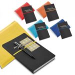 A5 notepad in imitation leather with hard cover and 160 lined pages and pen holder (pen not included). 140 x 210 mm