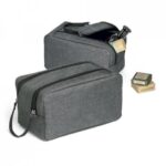 High density 300D cosmetic bag with padded handle, lined interior and zinner pocket with zipper. 200 x 115 x 140 mm